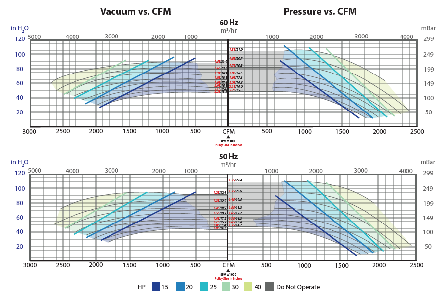 The RBX-250 can generate flow up to 2600 cfm and pressure greater than 100 in.H₂O, while attaining 80% peak efficiencies, requiring only 15-40 hp. The outlet can be rotated, the bearing housing is easy to remove, and the blower is poly-v belt driven.