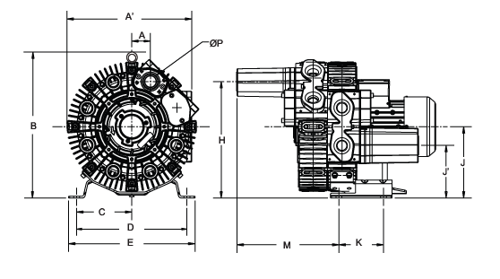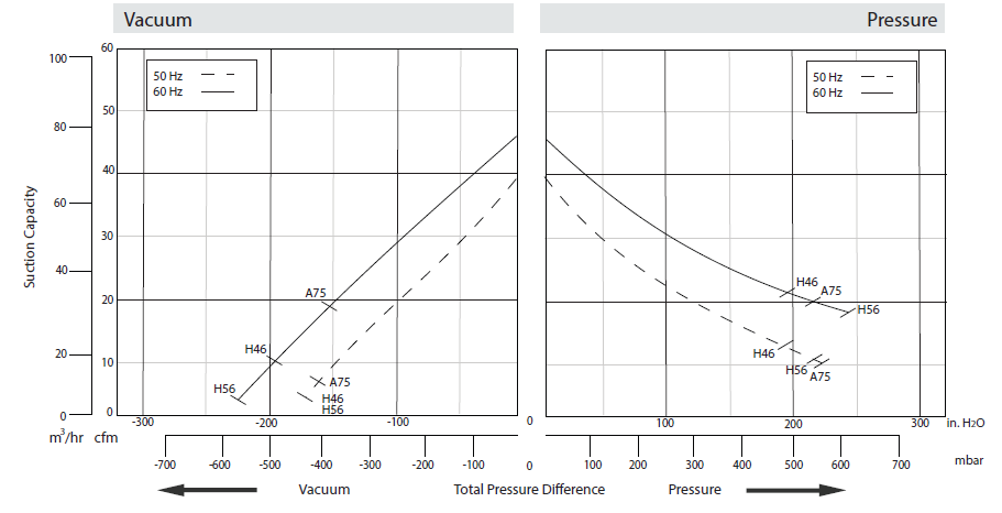 N/A The performance curves are based on air at a temperature of 59 ºF and an atmospheric pressure of 29.91 inch Hg with a tolerance of ±10%. The total pressure differences are valid for inlet and ambient temperatures up to 77 ºF. Suction capacity relates to inlet conditions. Pressure capacity relates to atmospheric conditions. For other conditions please contact Republic. Three phase motor tolerances are ±10% for fixed voltage motors and ±5% for voltage range motors. Single phase machines are designed with a ±5% tolerance. The frequency tolerance is ±2% maximum. |