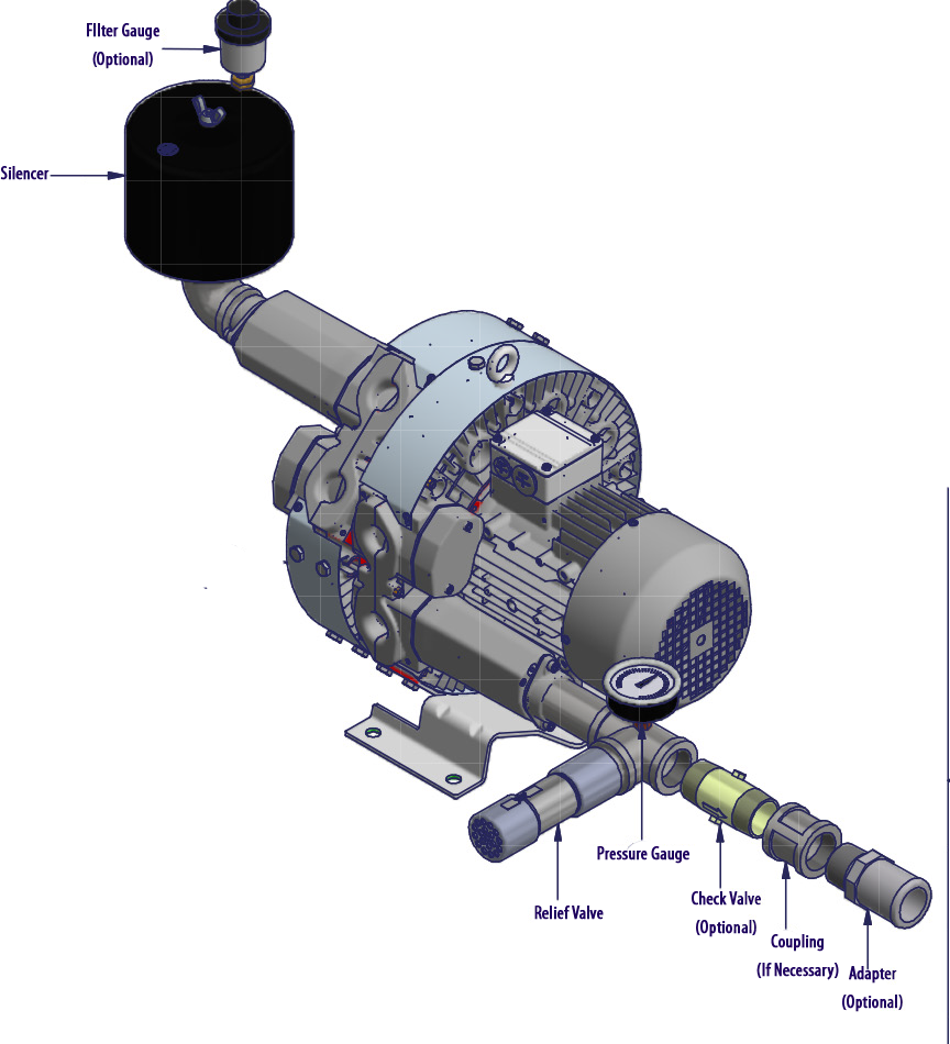 N/A All Republic Regenerative Blowers are available in pre-assembled kits for either pressure or vacuum applications. These kits include an inlet filter, gauge and relief valve, and are factory tested prior to shipment. Optional items for these kits include check valve, and tube adaptor; washdown motors, explosion proof motors, or other specialty motors; noise enclosures; and control panels such as VFD's, PLC's, or starter panels. |