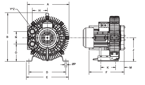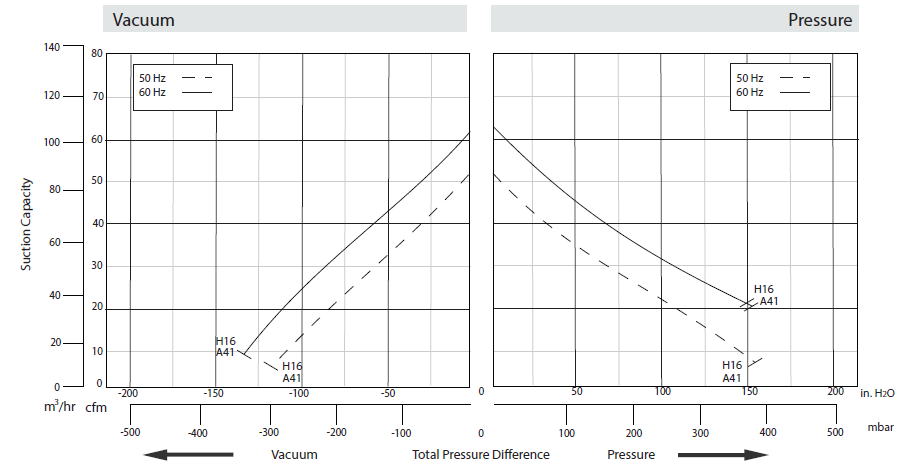 N/A The performance curves are based on air at a temperature of 59 ºF and an atmospheric pressure of 29.91 inch Hg with a tolerance of ±10%. The total pressure differences are valid for inlet and ambient temperatures up to 77 ºF. Suction capacity relates to inlet conditions. Pressure capacity relates to atmospheric conditions. For other conditions please contact Republic. Three phase motor tolerances are ±10% for fixed voltage motors and ±5% for voltage range motors. Single phase machines are designed with a ±5% tolerance. The frequency tolerance is ±2% maximum. |