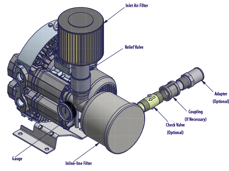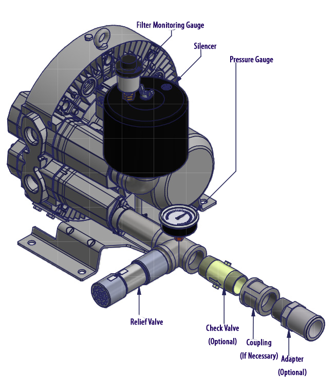 N/A All Republic Regenerative Blowers are available in pre-assembled kits for either pressure or vacuum applications. These kits include an inlet filter, gauge and relief valve, and are factory tested prior to shipment. Optional items for these kits include check valve, and tube adaptor; washdown motors, explosion proof motors, or other specialty motors; noise enclosures; and control panels such as VFD's, PLC's, or starter panels. |