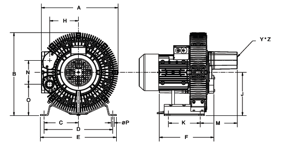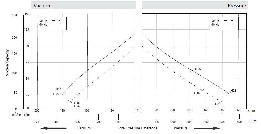 N/A The performance curves are based on air at a temperature of 59 ºF and an atmospheric pressure of 29.91 inch Hg with a tolerance of ±10%. The total pressure differences are valid for inlet and ambient temperatures up to 77 ºF. Suction capacity relates to inlet conditions. Pressure capacity relates to atmospheric conditions. For other conditions please contact Republic. Three phase motor tolerances are ±10% for fixed voltage motors and ±5% for voltage range motors. Single phase machines are designed with a ±5% tolerance. The frequency tolerance is ±2% maximum. |