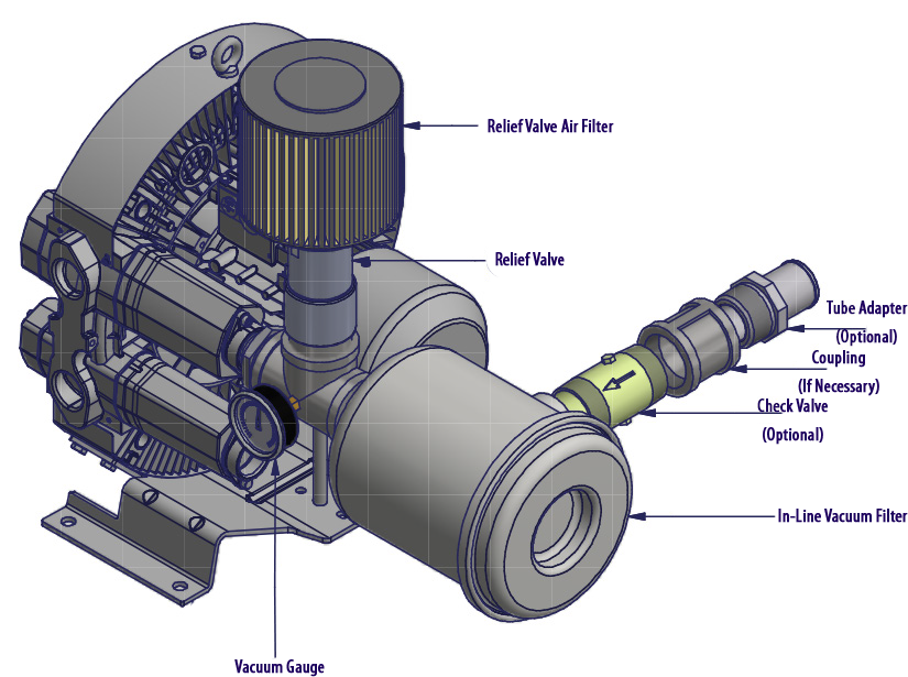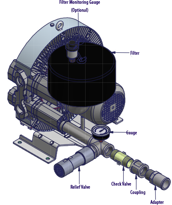 N/A All Republic Regenerative Blowers are available in pre-assembled kits for either pressure or vacuum applications. These kits include an inlet filter, gauge and relief valve, and are factory tested prior to shipment. Optional items for these kits include check valve, and tube adaptor; washdown motors, explosion proof motors, or other specialty motors; noise enclosures; and control panels such as VFD's, PLC's, or starter panels. |