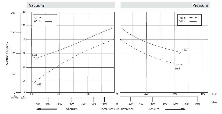 N/A The performance curves are based on air at a temperature of 59 ºF and an atmospheric pressure of 29.91 inch Hg with a tolerance of ±10%. The total pressure differences are valid for inlet and ambient temperatures up to 77 ºF. Suction capacity relates to inlet conditions. Pressure capacity relates to atmospheric conditions. For other conditions please contact Republic. Three phase motor tolerances are ±10% for fixed voltage motors and ±5% for voltage range motors. Single phase machines are designed with a ±5% tolerance. The frequency tolerance is ±2% maximum. |