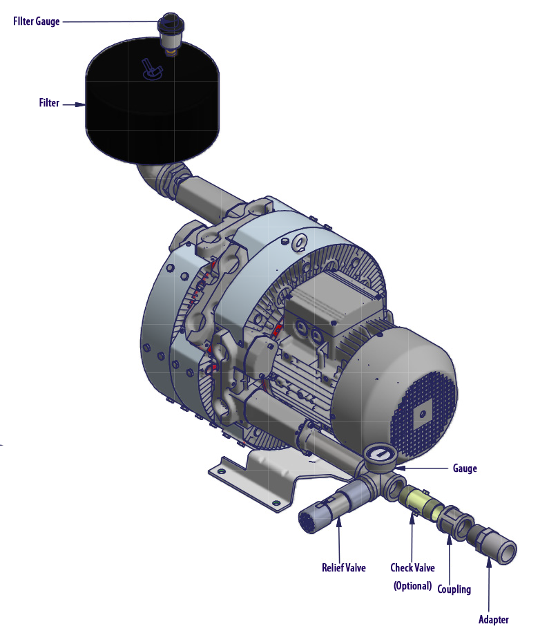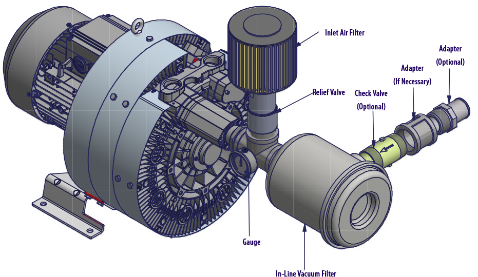 N/A All Republic Regenerative Blowers are available in pre-assembled kits for either pressure or vacuum applications. These kits include an inlet filter, gauge and relief valve, and are factory tested prior to shipment. Optional items for these kits include check valve, and tube adaptor; washdown motors, explosion proof motors, or other specialty motors; noise enclosures; and control panels such as VFD's, PLC's, or starter panels. |