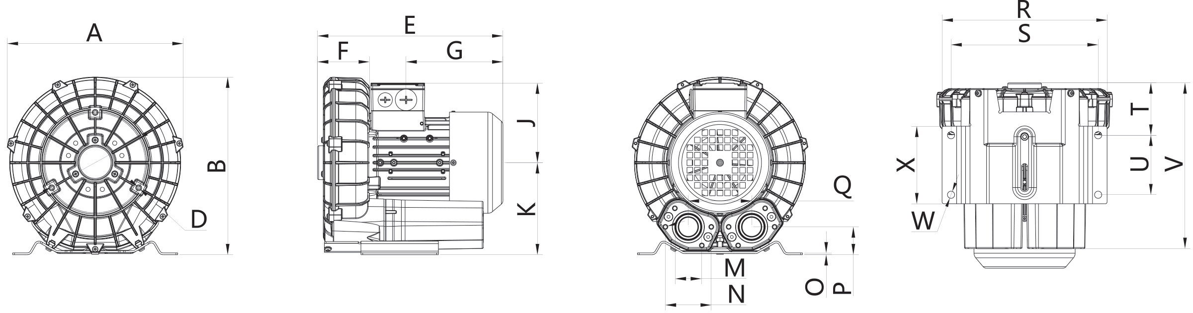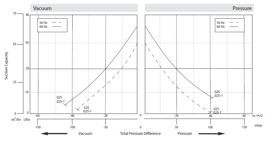 N/A The performance curves are based on air at a temperature of 59 ºF and an atmospheric pressure of 29.91 inch Hg with a tolerance of ±10%. The total pressure differences are valid for inlet and ambient temperatures up to 77 ºF. Suction capacity relates to inlet conditions. Pressure capacity relates to atmospheric conditions. For other conditions please contact Republic. Three phase motor tolerances are ±10% for fixed voltage motors and ±5% for voltage range motors. Single phase machines are designed with a ±5% tolerance. The frequency tolerance is ±2% maximum. |