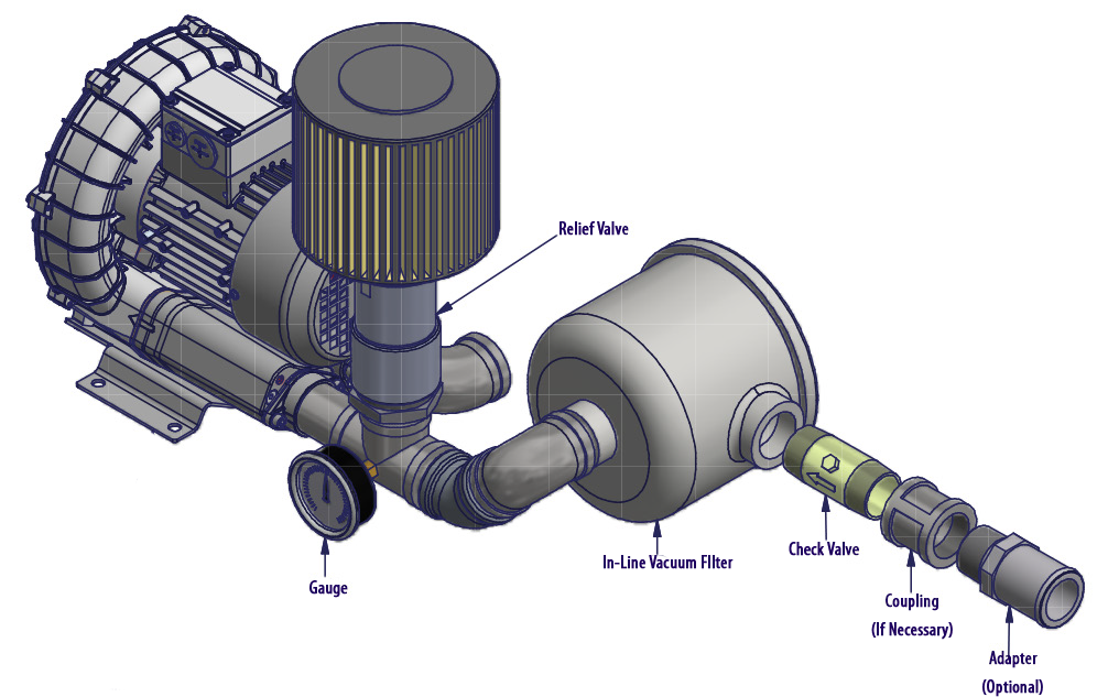 N/A All Republic Regenerative Blowers are available in pre-assembled kits for either pressure or vacuum applications. These kits include an inlet filter, gauge and relief valve, and are factory tested prior to shipment. Optional items for these kits include check valve, and tube adaptor; washdown motors, explosion proof motors, or other specialty motors; noise enclosures; and control panels such as VFD's, PLC's, or starter panels. |