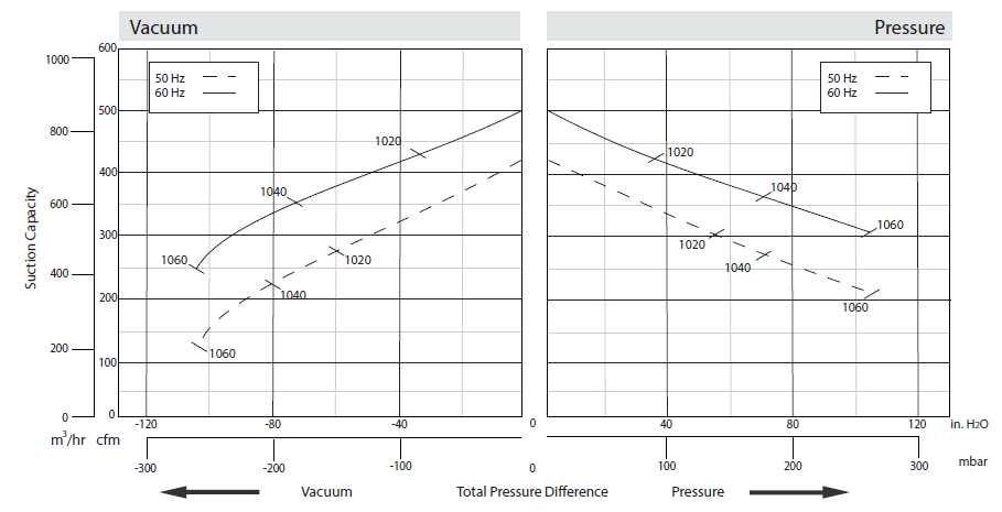 N/A The performance curves are based on air at a temperature of 59 ºF and an atmospheric pressure of 29.91 inch Hg with a tolerance of ±10%. The total pressure differences are valid for inlet and ambient temperatures up to 77 ºF. Suction capacity relates to inlet conditions. Pressure capacity relates to atmospheric conditions. For other conditions please contact Republic. Three phase motor tolerances are ±10% for fixed voltage motors and ±5% for voltage range motors. Single phase machines are designed with a ±5% tolerance. The frequency tolerance is ±2% maximum. |
