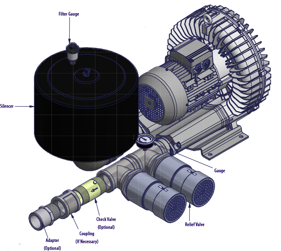 N/A All Republic Regenerative Blowers are available in pre-assembled kits for either pressure or vacuum applications. These kits include an inlet filter, gauge and relief valve, and are factory tested prior to shipment. Optional items for these kits include check valve, and tube adaptor; washdown motors, explosion proof motors, or other specialty motors; noise enclosures; and control panels such as VFD's, PLC's, or starter panels. |