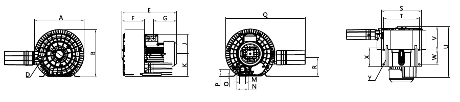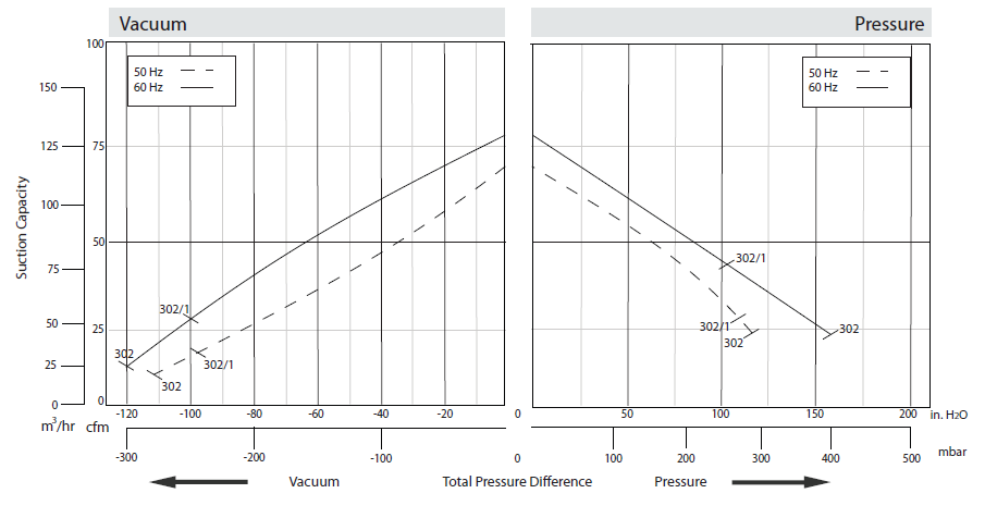 N/A The performance curves are based on air at a temperature of 59 ºF and an atmospheric pressure of 29.91 inch Hg with a tolerance of ±10%. The total pressure differences are valid for inlet and ambient temperatures up to 77 ºF. Suction capacity relates to inlet conditions. Pressure capacity relates to atmospheric conditions. For other conditions please contact Republic. Three phase motor tolerances are ±10% for fixed voltage motors and ±5% for voltage range motors. Single phase machines are designed with a ±5% tolerance. The frequency tolerance is ±2% maximum. |