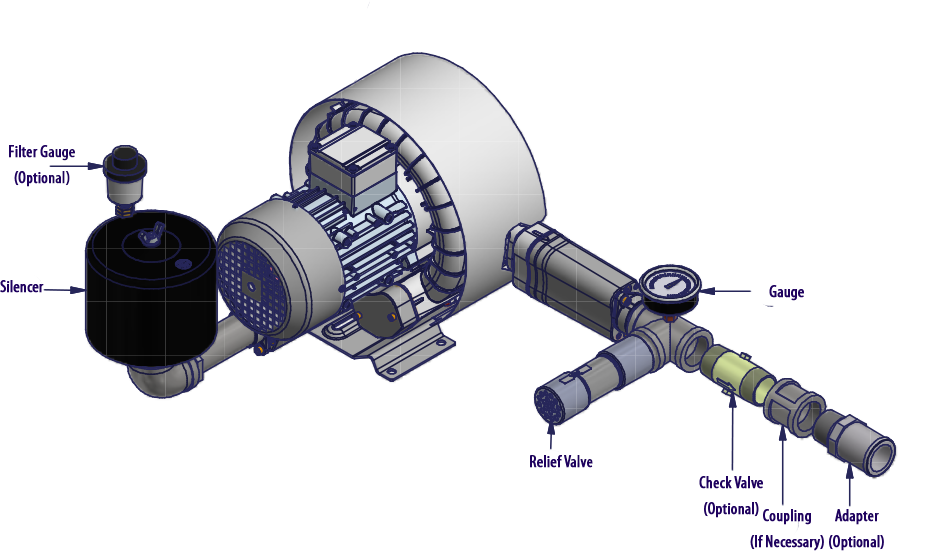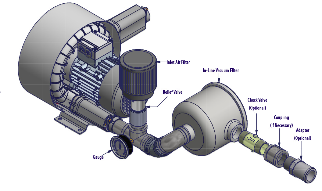 N/A All Republic Regenerative Blowers are available in pre-assembled kits for either pressure or vacuum applications. These kits include an inlet filter, gauge and relief valve, and are factory tested prior to shipment. Optional items for these kits include check valve, and tube adaptor; washdown motors, explosion proof motors, or other specialty motors; noise enclosures; and control panels such as VFD's, PLC's, or starter panels. |