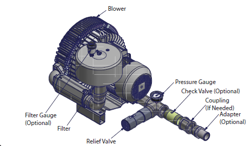 N/A All Republic Regenerative Blowers are available in pre-assembled kits for either pressure or vacuum applications. These kits include an inlet filter, gauge and relief valve, and are factory tested prior to shipment. Optional items for these kits include check valve, and tube adaptor; washdown motors, explosion proof motors, or other specialty motors; noise enclosures; and control panels such as VFD's, PLC's, or starter panels. |