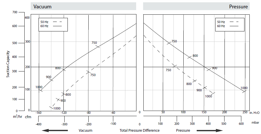 N/A The performance curves are based on air at a temperature of 59 ºF and an atmospheric pressure of 29.91 inch Hg with a tolerance of ±10%. The total pressure differences are valid for inlet and ambient temperatures up to 77 ºF. Suction capacity relates to inlet conditions. Pressure capacity relates to atmospheric conditions. For other conditions please contact Republic. Three phase motor tolerances are ±10% for fixed voltage motors and ±5% for voltage range motors. Single phase machines are designed with a ±5% tolerance. The frequency tolerance is ±2% maximum. |