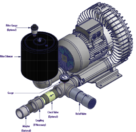 N/A All Republic Regenerative Blowers are available in pre-assembled kits for either pressure or vacuum applications. These kits include an inlet filter, gauge and relief valve, and are factory tested prior to shipment. Optional items for these kits include check valve, and tube adaptor; washdown motors, explosion proof motors, or other specialty motors; noise enclosures; and control panels such as VFD's, PLC's, or starter panels. |